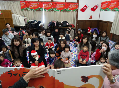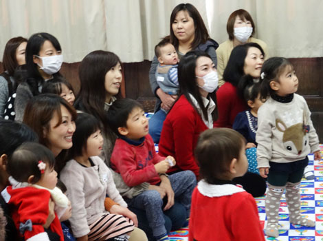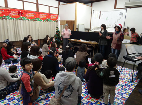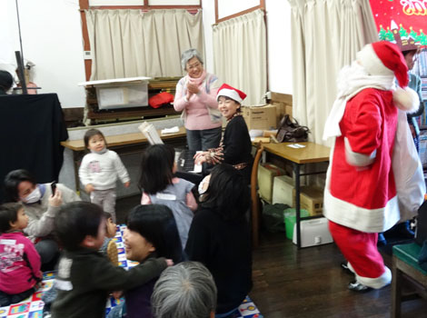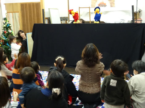 サンタさんの手あそびの後は、わくわくクラブによる人形劇"ぐりとぐらのおきゃくさま"です。 人形劇の中にサンタさんを待つ大きな子ども(?)やまっしろなおひげの本物サンタさんも出てきて、子どもたちはもう夢中です。途中で、参加している子どもが突然キャストになる場面もあって、会場は大盛り上がり!