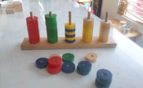本体は、少し厚みのある板に棒が5本立っています。 コイン型部品は、5色各10コづつあり、ひもやサイコロも付いています。
