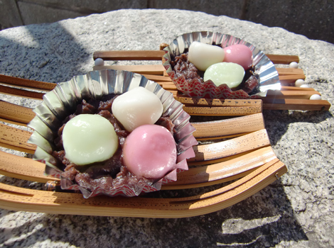 | (4) | 器やマドレーヌカップなどにあんこを敷いて、その上に3色の白玉を乗せる。 |